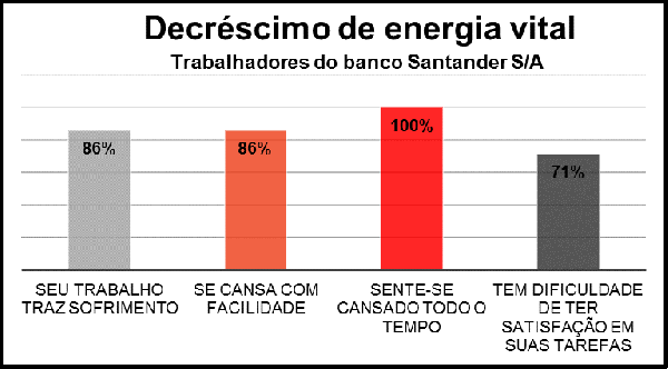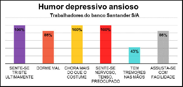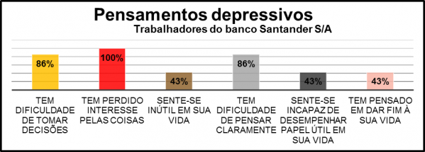 Avaliações Psicológicas - Avaliações psicológicas em diversas agências em Santa Catarina, por meio do instrumento SRQ 20 (avaliação do sofrimento mental), concluiu que os bancários do Santander “se encontram em níveis de sofrimento extremo em decorrência das distorções na organização e condições de trabalho”.