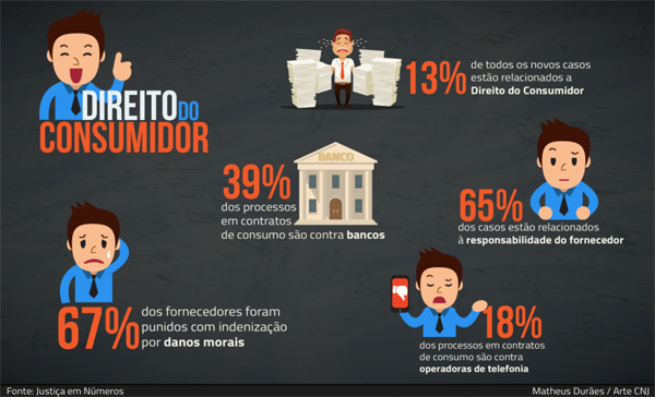 O estudo do DPJ/CNJ aponta um perfil das ações relativas a direito do consumidor, que corresponderam a 13% dos assuntos de processos submetidos aos tribunais no ano passado. Somadas aos bancos, as empresas de telefonia e prestadoras de planos de saúde foram os principais segmentos acionados na Justiça em processos de relações de consumo, com 18% e 8% do total de ações, respectivamente.