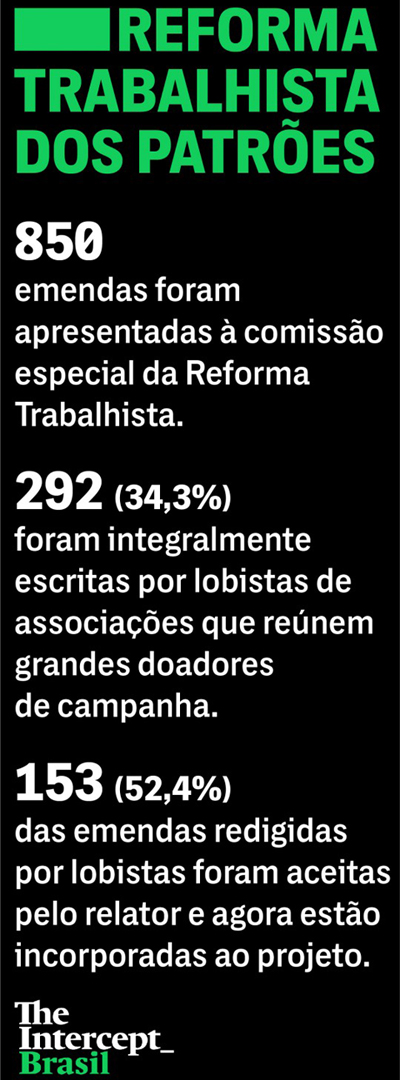 The Intercept Brasil examinou as 850 emendas apresentadas por 82 deputados durante a discussão do projeto na comissão especial da reforma trabalhista. Dessas propostas de “aperfeiçoamento”, 292 (34,3%) foram integralmente redigidas em computadores de representantes da Confederação Nacional do Transporte (CNT), da Confederação Nacional das Instituições Financeiras (CNF), da Confederação Nacional da Indústria (CNI) e da Associação Nacional do Transporte de Cargas e Logística (NTC&Logística).