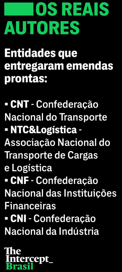 O deputado apresentou 22 emendas à reforma trabalhista. Todas elas, sem exceção, foram redigidas por um assessor legislativo da CNT. O deputado Renzo Braz (PP-MG) também chama a atenção. Todas as suas 19 emendas foram preparadas pelo mesmo assessor. Além de ser de família ligada ao transporte de cargas, sua campanha de 2014 foi bancada majoritariamente por empresas do setor de transportes.