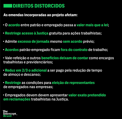As propostas encampadas pelos deputados modificam a CLT e prejudicam os direitos dos trabalhadores. O texto original enviado pelo governo alterava sete artigos das leis. O substitutivo de Rogério Marinho, contando com as emendas, mexe em 104 artigos, entre modificações, exclusões e adições.