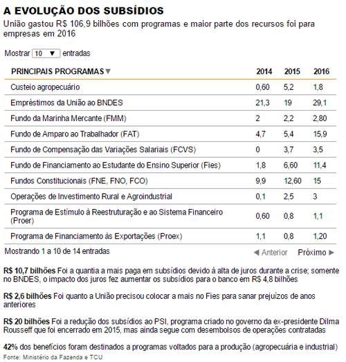 No momento em que se esforça para cortar despesas para reduzir o deficit orçamentário, o governo de Michel Temer gastou cerca de R$ 107 bilhões com subsídios financeiros em 2016, segundo auditores do TCU (Tribunal de Contas da União).