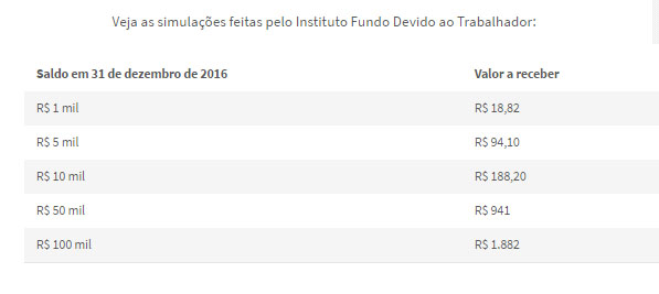 A CEF não sabe dizer exatamente quanto cada trabalhador ganhará com essa distribuição da metade dos lucros do FGTS. Mas um cálculo feito pelo Instituto Fundo Devido ao Trabalhador, antigo FGTS Fácil, ONG que tem o objetivo fiscalizar o FGTS, estima que, para cada R$ 1 mil de saldo, o trabalhador receberá R$ 18,82 de remuneração.