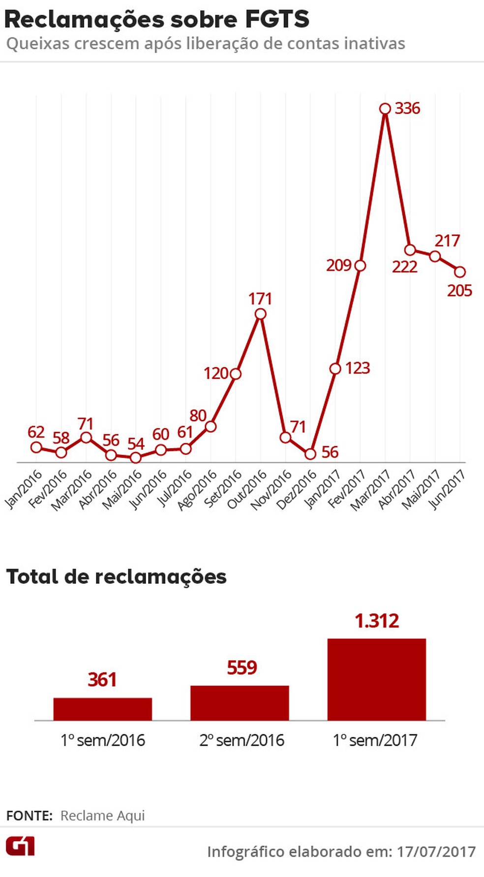 Em 2016, o total de reclamações envolvendo FGTS foi de 920. De janeiro até junho de 2017, já são 1.312 – 43% a mais levando em conta apenas a metade deste ano.