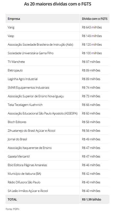 Segundo levantamento feito pelo G1 com dados da PGFN, as 20 empresas com as dívidas mais altas somam cerca de 8% do valor total atrasado que é devido ao FGTS, com quase R$ 2 bilhões.