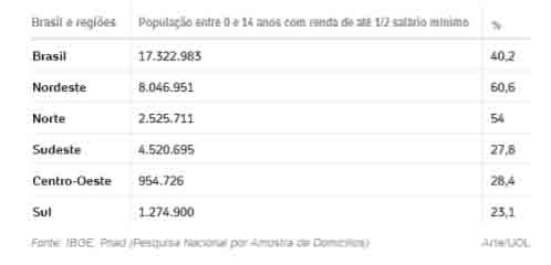 Em números absolutos, no entanto, a região Sudeste tem mais de 4,5 milhões de crianças e adolescentes vivendo em condição de pobreza familiar --no Nordeste, são cerca de 8 milhões e, no Norte, pouco mais de 2,5 milhões.