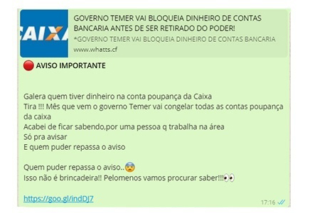 Boato que circula no WhatsApp diz que governo vai confiscar poupança da Caixa O boato divulgado nas redes sociais diz, em mau português, que o "Governo Temer vai bloqueia (sic) dinheiro de contas bancaria (sic)". E faz o seguinte alerta: "Aviso Importante Galera quem tiver dinheiro na conta poupança da Caixa Tira!!! Mês que vem o governo Temer vai congelar todas as contas poupança da caixa. Acabei de ficar sabendo, por uma pessoa q trabalha na área Só pra avisar E quem puder repassa o aviso. Isso não é brincadeira!! Pelomenos vamos procurar saber!!!"