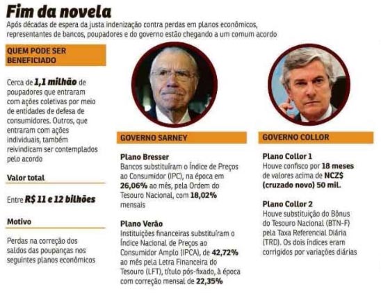 Essa é a estimativa da indenização a ser paga a depositantes de cadernetas de poupança, no caso das ações judiciais que reivindicam a reposição das perdas sofridas durante planos econômicos das décadas de 1980 e 1990. A expectativa é de que sejam ressarcidos pelo menos 1,1 milhão de pessoas. No entanto, nem todos os autores das ações serão beneficiados. “Muitos já morreram. Nesses casos, o dinheiro será destinado aos herdeiros”, afirmou uma pessoa ligada às negociações.