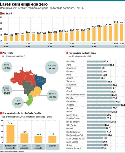 O quadro mais drástico está na região Nordeste. Dos domicílios nordestinos, 27,2% (cerca de 5 milhões de lares) não têm ninguém empregado. A situação é pior em Alagoas: 35% dos lares no Estado não têm renda do trabalho. O resultado tem origem nos problemas crônicos da região (baixa escolaridade, falta de oportunidades), agravados pela crise econômica.