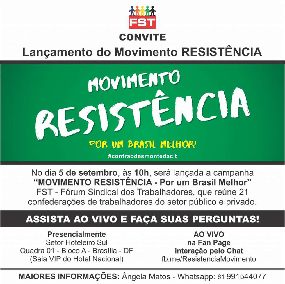O Fórum Sindical dos Trabalhadores (FST), do qual a CONTEC participa, lançará no dia 5 de setembro, às 10h, a campanha Movimento Resistência Por Um Brasil Melhor, no auditório do Hotel Nacional, em Brasília (DF).