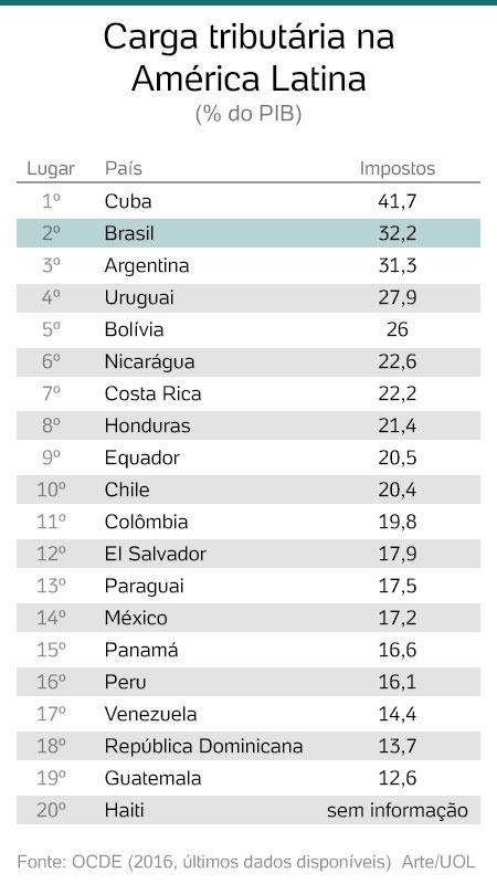 A carga média dos países da OCDE, o grupo que reúne os países mas ricos do mundo, foi de 34,3% do PIB em 2016. O valor está acima dos 32,2% contabilizados no Brasil naquele ano. Mas a média dos países latino-americanos e caribenhos é de 23%, o que põe o Brasil no segundo lugar do ranking regional.
