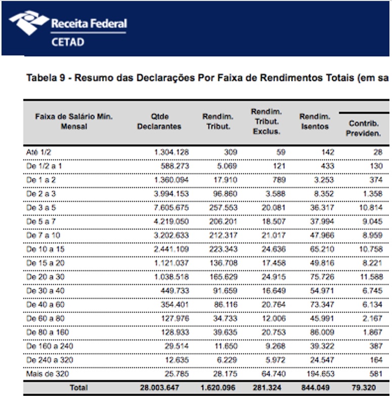 Vejam a tabela a seguir, parte da tabela 9 (disponível no link ) , que mostra as faixas de renda, em números de salários mínimos, a quantidade de declarantes e o respectivo valor (em milhões de Reais) do rendimento tributado, tributado exclusivamente na fonte e isento. Mostra também o valor da contribuição previdenciária paga: