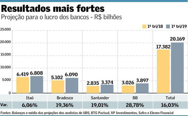 Os grandes bancos brasileiros de capital aberto vão mostrar resultados mais fortes no primeiro trimestre deste ano, mesmo com a atividade econômica aquém do esperado. Juntos, Itaú Unibanco, Banco do Brasil (BB), Bradesco e Santander devem ter lucro líquido recorrente de R$ 20,169 bilhões no período de janeiro a março, aponta média das projeções de analistas consultados pelo Valor. O resultado, se confirmado, será 16% superior ao obtido no mesmo período de 2018.