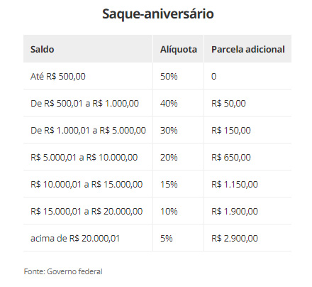 Na modalidade saque-aniversário, os cotistas com saldo menor poderão sacar anualmente percentuais maiores (veja na tabela abaixo):
