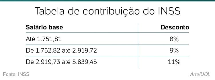 Em um salário de R$ 4.000, por exemplo, o contribuinte pagará 11% de INSS (veja os descontos na tabela abaixo), o equivalente a R$ 440 de desconto em folha, restando R$ 3.560 no salário.