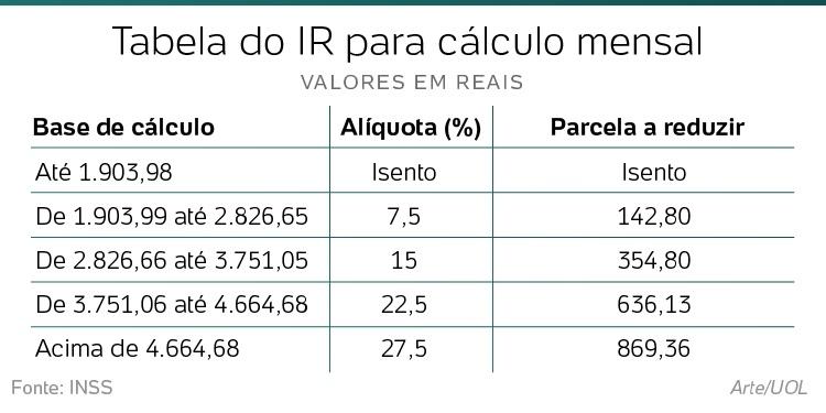 As alíquotas do Imposto de Renda são de 7,5%, 15%, 22,5% e até 27%, de acordo com o salário base. Existe uma dedução para cada faixa salarial.