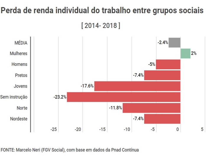 No levantamento, aponta Neri, o único grupo que teve um resultado positivo foram as mulheres, que viram a renda média crescer 2% entre 2014 e 2018, enquanto a dos homens recuou 5%.