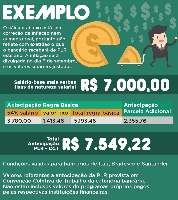 Portanto, esta primeira parcela da PLR 2019 virá com correção da inflação (no período entre 1º de setembro de 2018 e 31 de agosto de 2019), mais 1% de aumento real. O governo só divulgará a inflação do período (INPC) no dia 6 de setembro, e só então o bancário poderá saber quanto receberá exatamente de PLR. Após a divulgação, o Sindicato dos Bancários de São Paulo disponibilizará no site um simulador, para que os trabalhadores vejam quanto receberão.