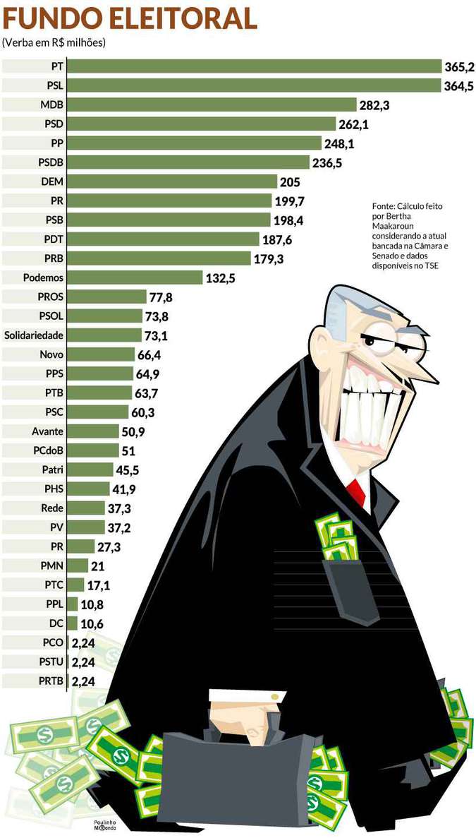 Ao enviar os valores para a Lei de Diretrizes Orçamentárias, o Ministério da Economia afirmou estar obedecendo cálculos da atribuiu do Tribunal Superior Eleitoral (TSE). O PSL de Bolsonaro deve receber R$ 112 milhões caso o texto seja aprovado. Ano passado, a sigla -- que era nanica -- recebeu R$ 8 milhões. A previsão é que a LDO seja votada nesta quarta-feira. Procurado, Cacá Leão não retornou às ligações.