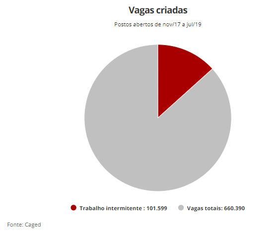 Desde a entrada em vigor da nova lei trabalhista, em novembro de 2017, até julho deste ano, foram criadas 101,6 mil vagas na modalidade de trabalho intermitente, segundo dados do Cadastro Geral de Empregados e Desempregados (Caged) do Ministério da Economia. O número de postos gerados representa 15,4% do total de vagas criadas no período no país (660.390) – ou seja, quase uma em cada seis vagas criadas foi para a modalidade de contrato intermitente.