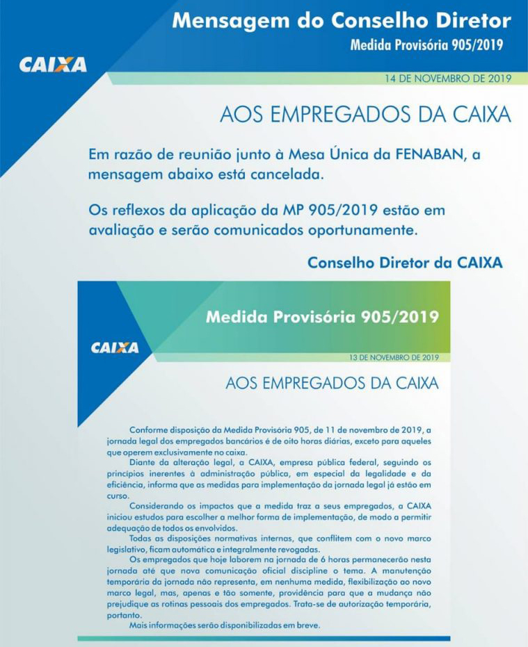 Empregados da Caixa foram surpreendidos, ontem (13), com um comunicado interno da direção do banco estipulando nova jornada de trabalho para a categoria. A mudança seria por conta da Medida Provisória 905, publicada terça-feira (12), no Diário Oficial da União (DOU).