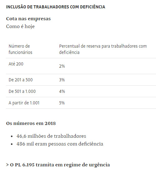 A projeto traz ainda outras mudanças em relação às cotas, como a contagem em dobro quando da contratação de um trabalhador com deficiência grave, e a inclusão de aprendizes nessa verificação.