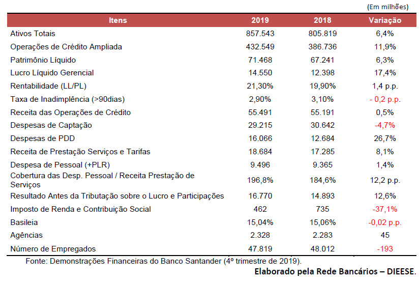 O banco Santander obteve um Lucro Líquido Gerencial de R$ 14,550 bilhões em 2019, crescimento de 17,4%, em relação a 2018, e de 0,6% no trimestre, segundo análise realizada pelo Departamento Intersindical de Estatística e Estudos Socioeconômicos (Dieese), com base no balanço apresentado pelo banco nesta quarta-feira (29). O resultado foi positivamente impactado pela entrada de créditos tributários no montante de R$ 3,3 bilhões e pelas receitas de serviços e tarifas. A rentabilidade (Retorno sobre o Patrimônio Líquido Médio Anualizado – ROE) foi de 21,3%, com alta de 1,4 pontos percentuais em doze meses. O lucro obtido no Brasil representou 28% do lucro global, que foi de € 8,252 bilhões (com crescimento de 3% em um ano).