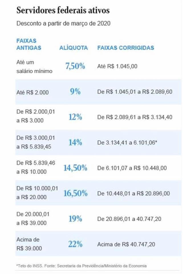 Valores atualizados começam a ser aplicados sobre os salários, conforme aprovado na reforma da Previdência, no ano passado. Não há mudança para trabalhadores autônomos.