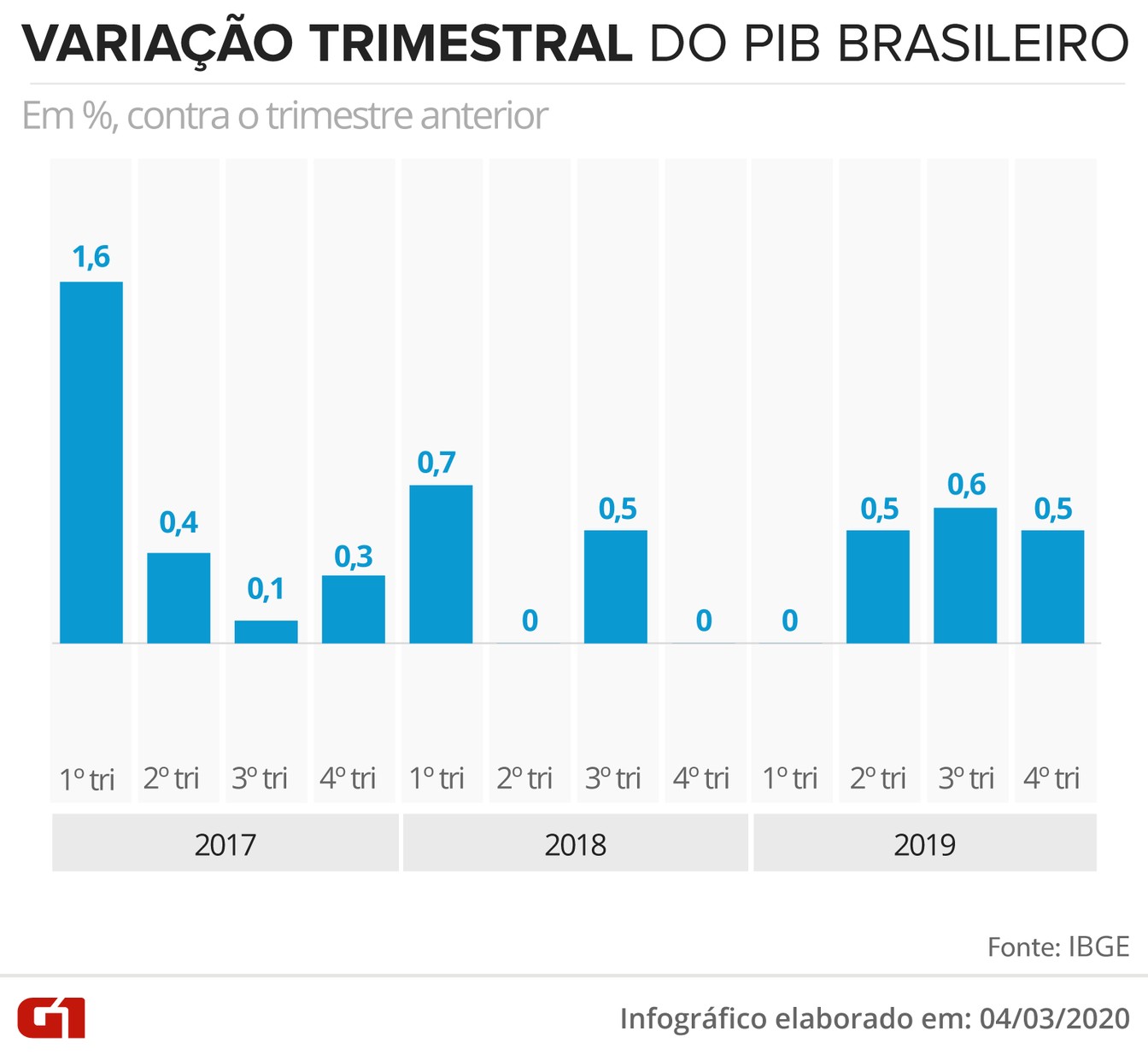 No 4º trimestre, o PIB cresceu 0,5% na comparação com o trimestre anterior, o que representa uma desaceleração frente ao avanço de 0,6% registrado no 3º trimestre. Na comparação com o 4º trimestre de 2018, houve alta de 1,7%, o 12º resultado positivo consecutivo.