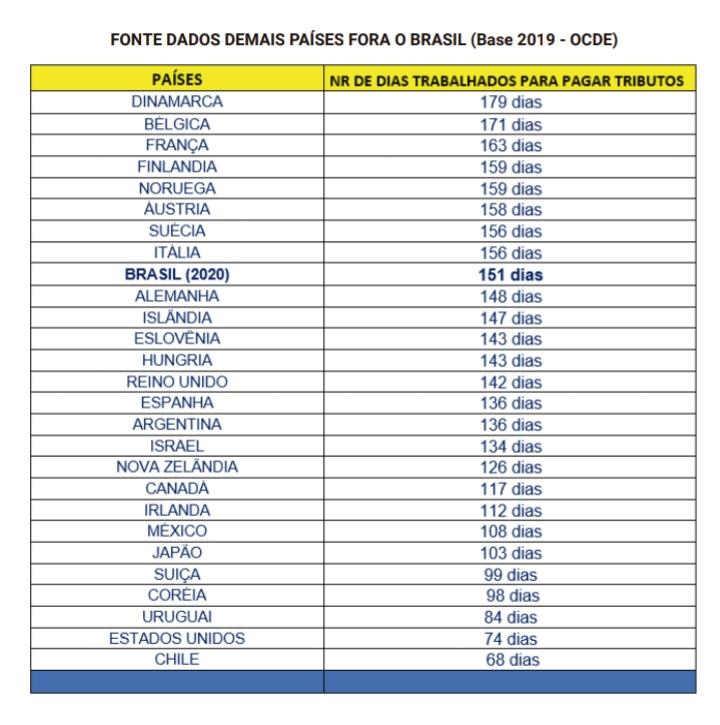Assim, o Brasil figura entre os países que têm os maiores números de dias trabalhados para pagar impostos, atrás de Dinamarca, Suécia e Itália, por exemplo.