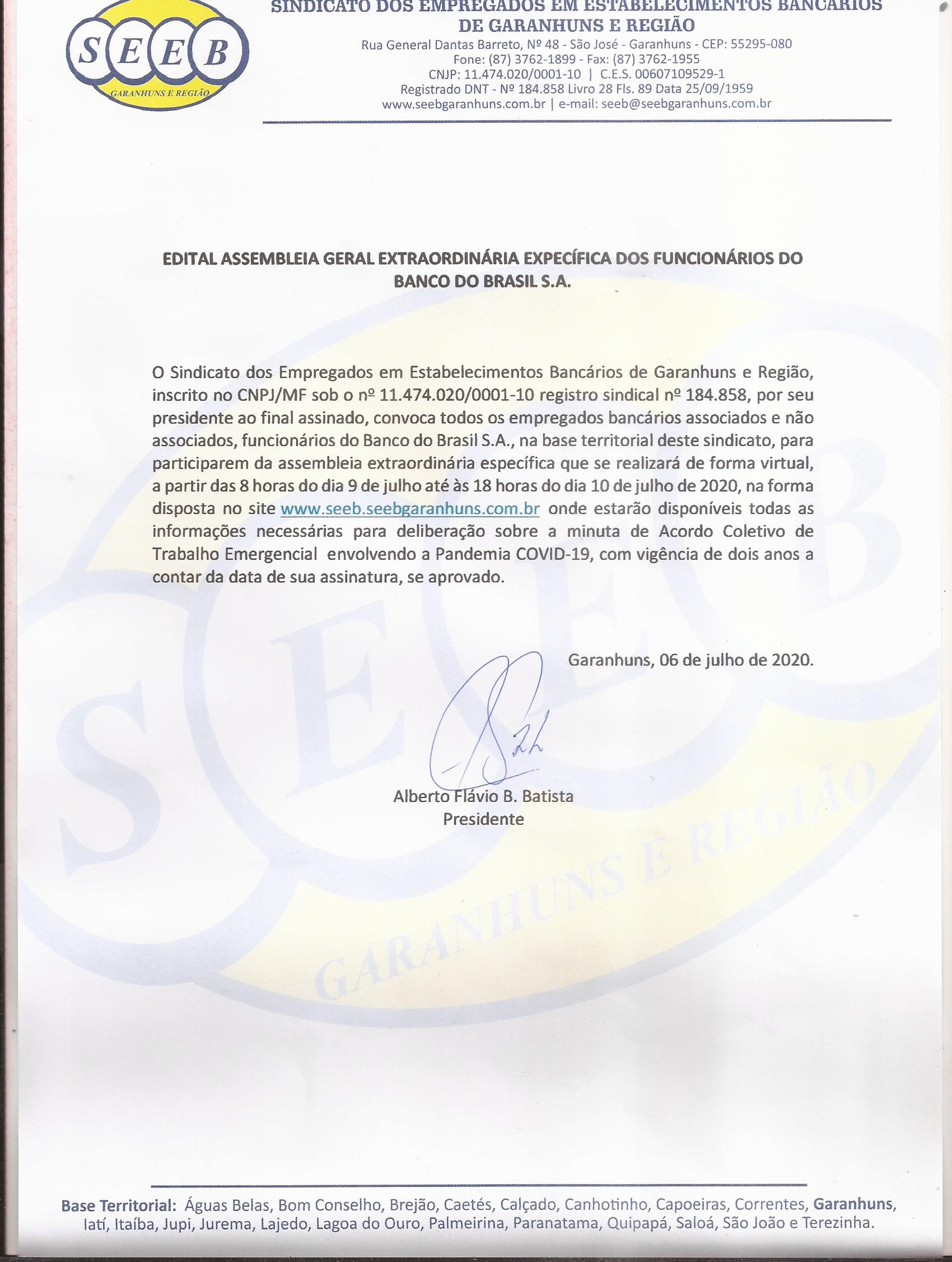 EDITAL ASSEMBLEIA GERAL EXTRAORDINÁRIA ESPECÍFICA DOS FUNCIONÁRIOS DO BANCO DO BRASIL S.A