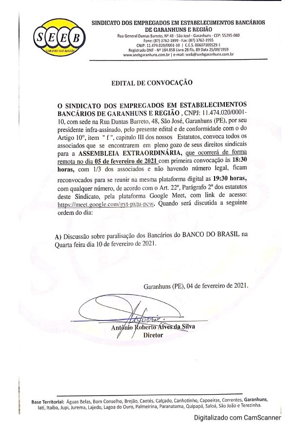 O SEEB Garanhuns e Região convida a todos os seus associados do Banco do Brasil, a participarem da Assembleia Geral extraordinária que ocorrerá de forma remota.
