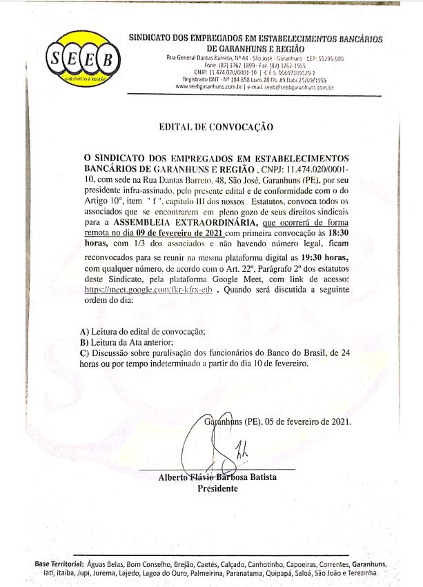 Assunto: Discussão sobre paralisação dos funcionários do Banco do Brasil, de 24 horas ou por tempo indeterminado a partir do dia 10 de fevereiro de 2021.