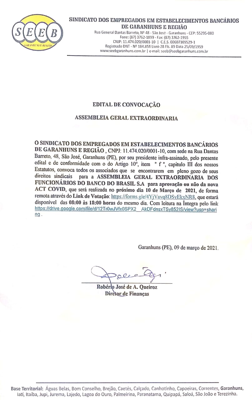 O Sindicato dos Empregados em Estabelecimentos Bancários de Garanhuns e Região, convoca a todos os associados funcionários do BANCO DO BRASIL S.A
