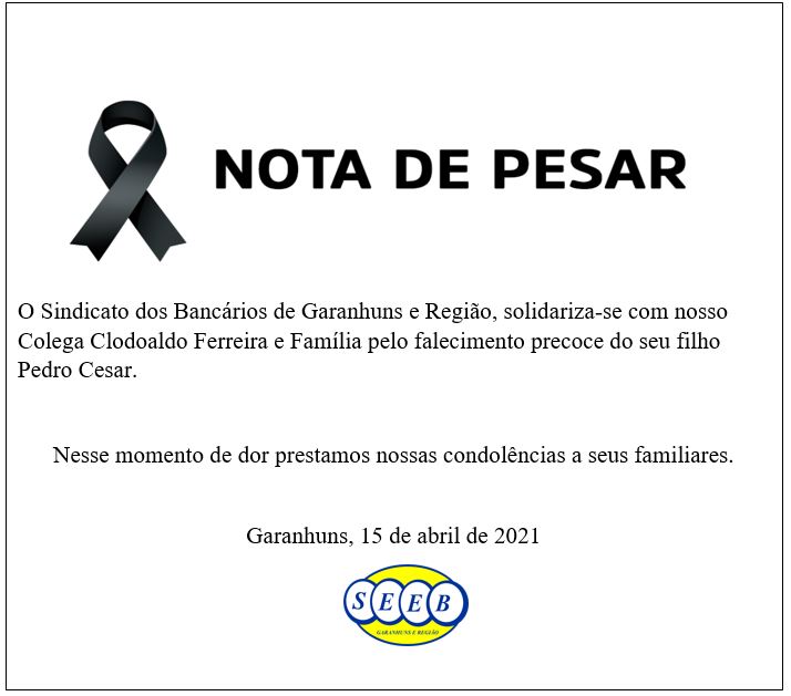 O Sindicato dos Bancários de Garanhuns e Região, solidariza-se com nosso Colega Clodoaldo Ferreira e Família pelo falecimento precoce do seu filho Pedro Cesar.