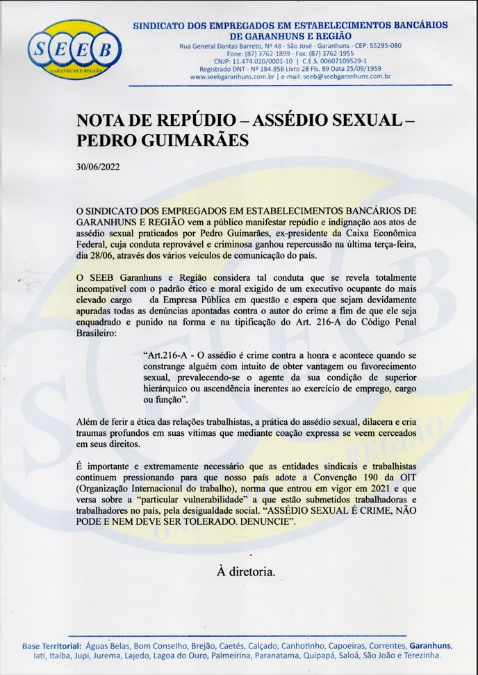 Nota de repúdio- Assédio Sexual- Pedro Guimarães