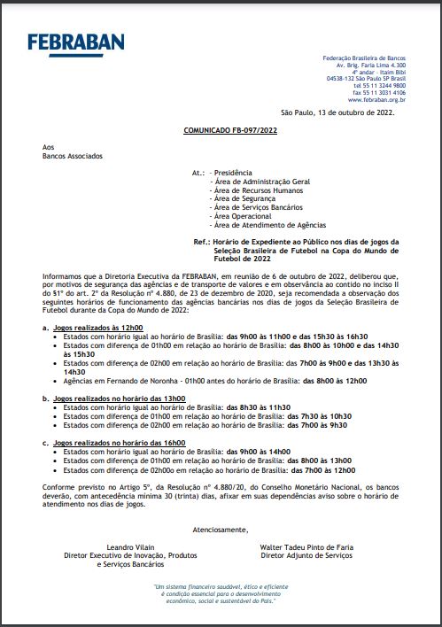Comunicado FEBRABAN- Horário de Funcionamento durante os jogos da copa