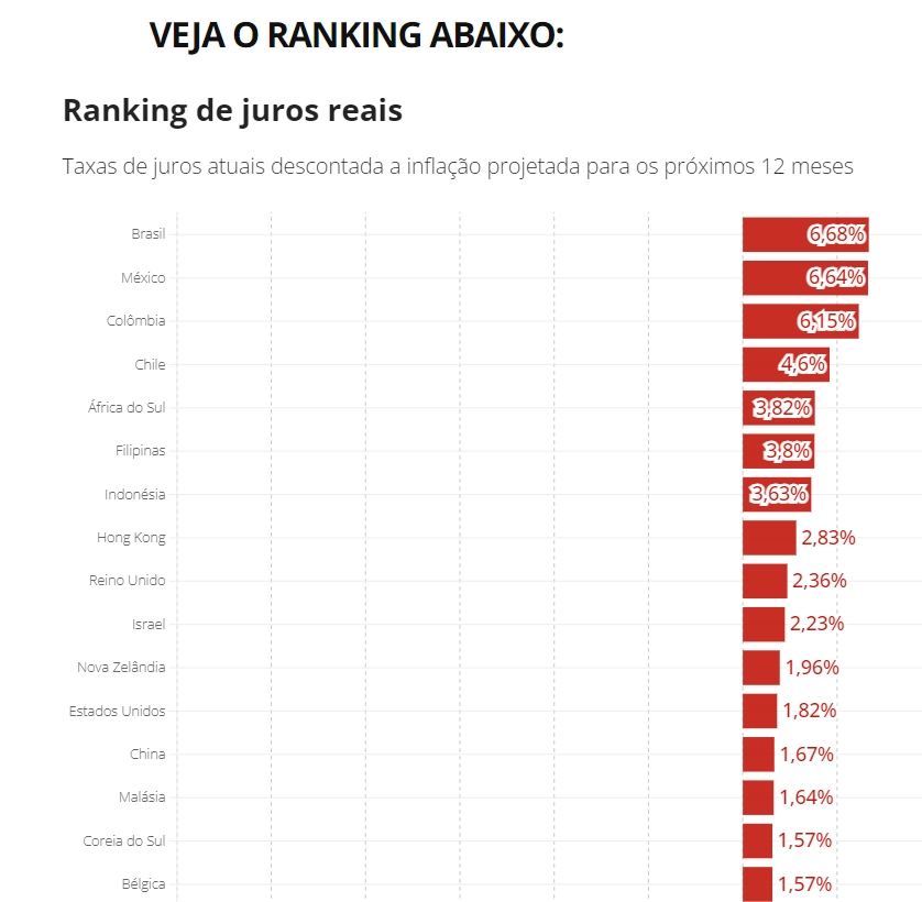 Mesmo com a queda da taxa básica de juros brasileira (Selic), o país continua no topo do ranking global de juros reais, segundo levantamento compilado pelo MoneYou. A Argentina, que enfrenta uma hiperinflação, segue na última posição da lista de 40 países (veja mais abaixo).