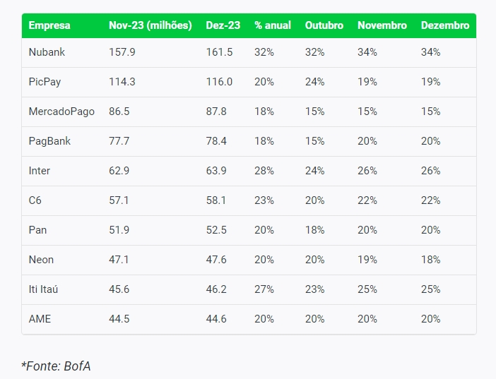 O Nubank registrou a maior base de usuários no levantamento, com 58 milhões de usuários ativos, “concentrando 1/3 da indústria”. O segundo é o PicPay, com 24 milhões.