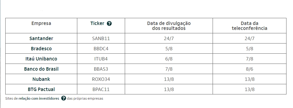As principais instituições financeiras já definiram as datas em que divulgam seus resultados referentes ao segundo trimestre deste ano. Bem como as datas em que realizarão suas conferências.