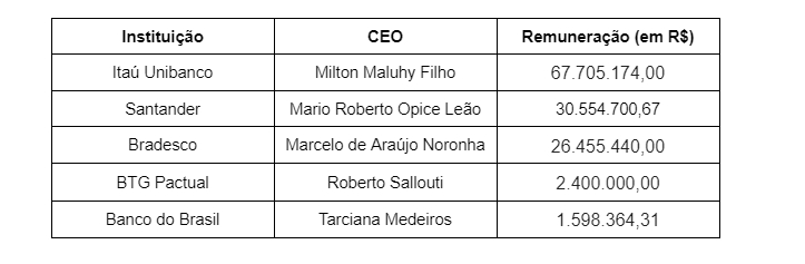 No caso das lideranças de grandes bancos não seria diferente. Um deles está no topo do ranking das maiores remunerações entre CEOs de empresas de capital aberto no Brasil.