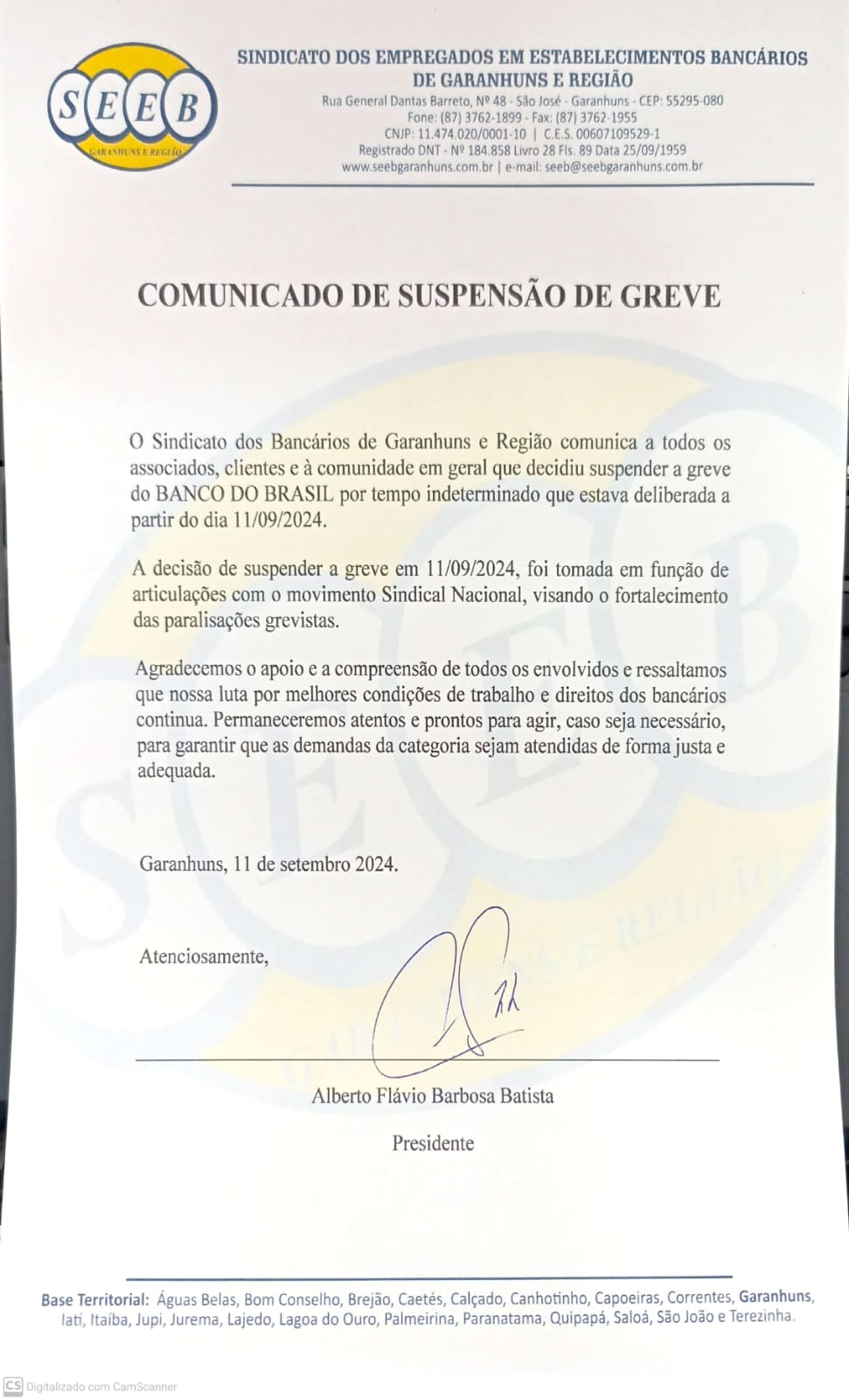 COMUNICADO DE SUSPENSÃO DE GREVE BANCO DO BRASIL