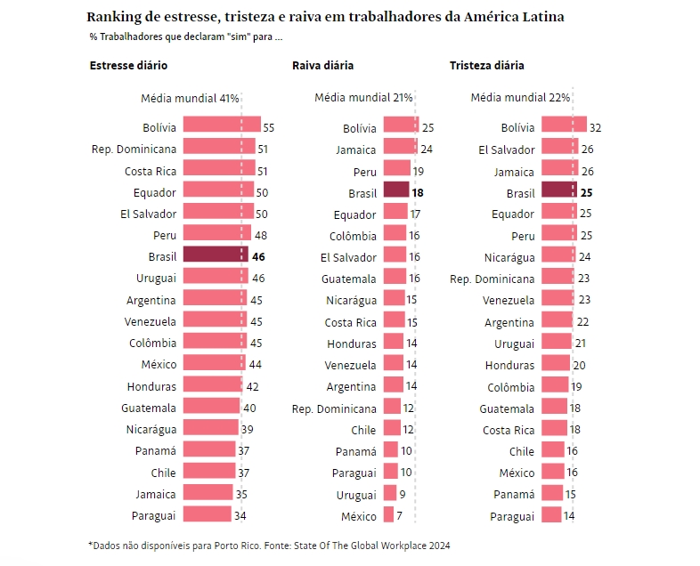 O estudo "State Of The Global Workplace" revelou que os trabalhadores brasileiros estão em quarto lugar na América Latina em sentimentos de raiva e tristeza, e em sétimo lugar quando se trata de estresse.