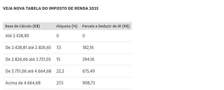 A tabela traz reajuste de 7,51% na primeira faixa —a de isenção—, que sobe dos atuais R$ 2.259,20 para R$ 2.428,80, ampliando o número de trabalhadores que não vão pagar IR.