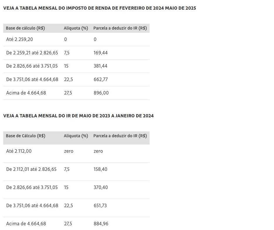 A tabela do IR foi reajustada no ano passado. Como ocorreu em 2023, além de um percentual fixo, o governo concedeu um desconto-padrão para isentar todos trabalhadores, aposentados e pensionistas que ganham até dois salários mínimos. (Fonte: Folha de SP)