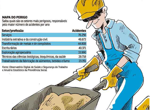 As áreas nas quais ocorrem mais acidentes são a construção civil e o setor de serviços. Na construção, o último dado sobre óbitos é de 2009, quando 395 trabalhadores morreram em serviço. Mas o número pode ser maior, já que, em muitos casos, a certidão de óbito não contém a causa exata da morte, nem o local onde ocorreu.