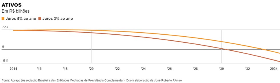 Se não houver mudanças no setor, diz, os recursos dos fundos de previdência fechados se esgotarão entre 2031 e 2034, dependendo da taxa de juros reais estimada (3% e 5% ao ano, respectivamente).