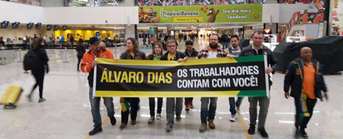 Iara Freire, diretora da Federação dos Bancários do Paraná e secretária Geral da Central Sindical – UGT-PR , realizaram nesta segunda-feira (26), das 6 às 8h, no Aeroporto Internacional Afonso Pena, na Grande Curitiba, um ato para exigir do senador Álvaro Dias (PV-PR), que vote contra as reformas da Previdência (PEC 287/16) e trabalhista (PLC 38/17) do governo.