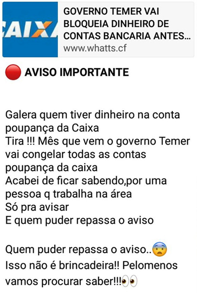 A mensagem, distribuída sobretudo por WhatsApp, recomenda a retirada de dinheiro de poupanças da Caixa Econômica Federal, porque o governo congelará todas as contas “no mês que vem”.
