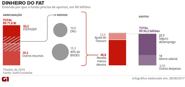 O fundo teve uma arrecadação de R$ 71,6 bilhões em 2016 e gastos de R$ 56 bilhões. Mas, como parte desses recursos são desviados para outros fins, falta dinheiro para arcar com os gastos de seguro-desemprego e abono salarial. Para a conta fechar, o FAT precisa de aportes do Tesouro Nacional.